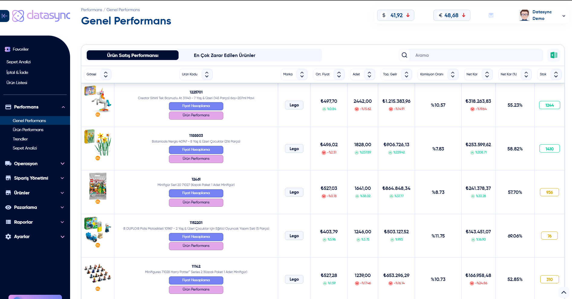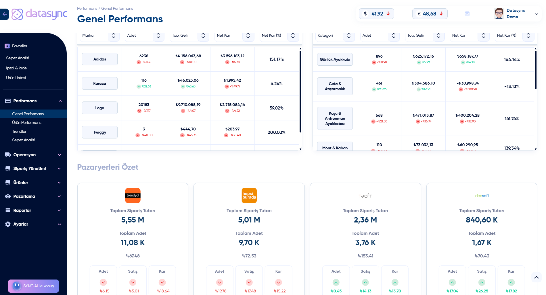 DataSync Genel Performans, e-ticaret markalarının tüm pazaryerlerindeki performans ve kârlılığını tek ekranda, anlık ve doğru şekilde gösteren bir analiz modülüdür.
